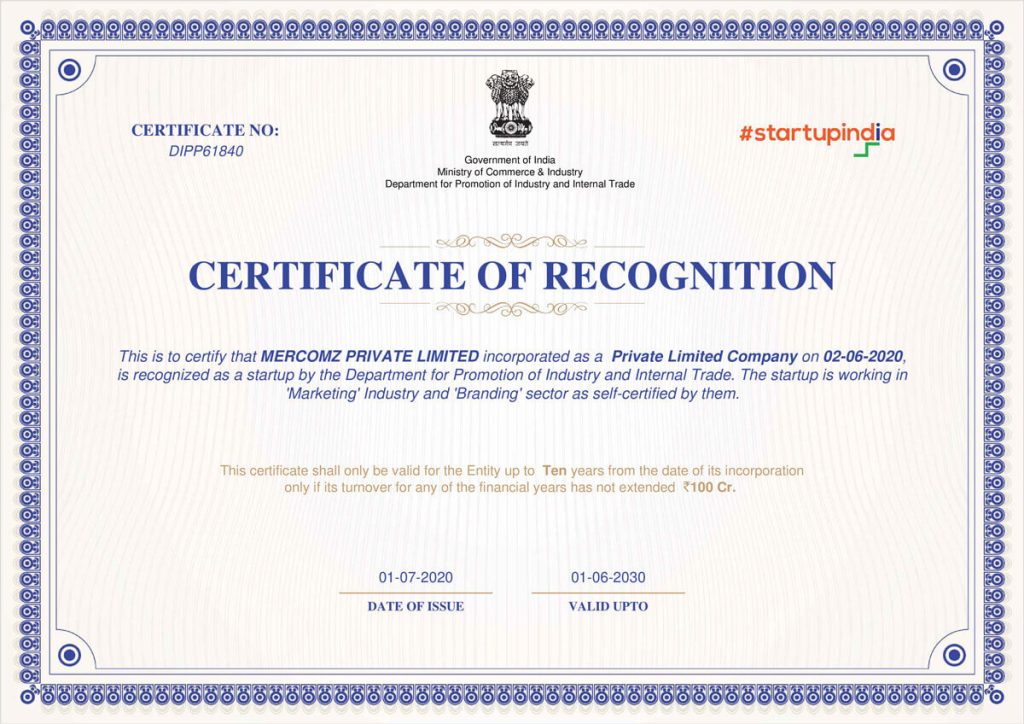 Mercomz is a Startup recognized by the Department for Promotion of Industry and Internal Trade, Ministry of Commerce & Industry, Government of India.